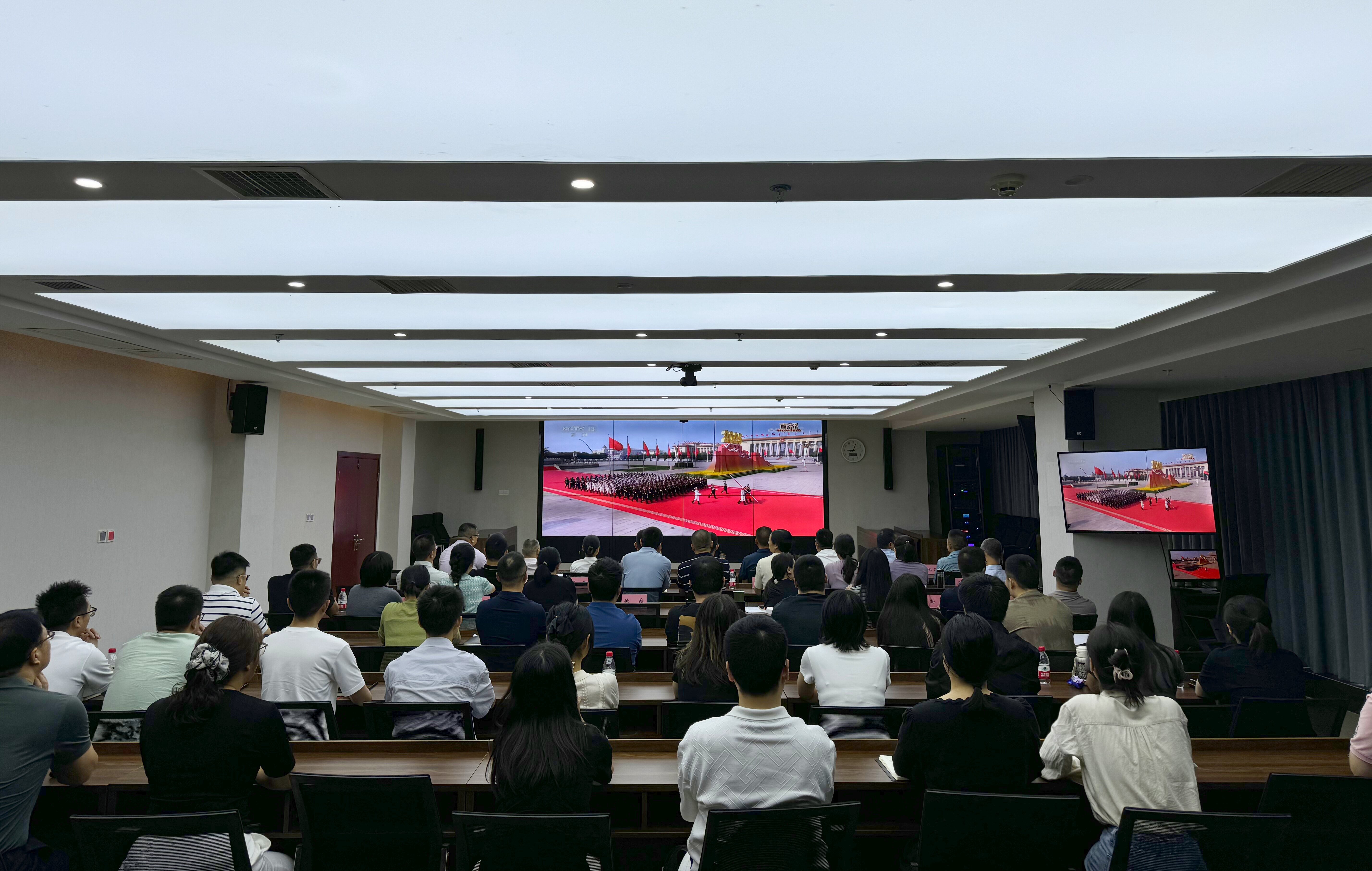 在集團(tuán)機(jī)關(guān)會議室,干部職工神情莊重,通過高清投影實時觀看紀(jì)念大會直播,從莊嚴(yán)肅穆的紀(jì)念儀式到振奮人心的重要講話,每一個環(huán)節(jié)都讓在場人員深受震撼。與此同時,集團(tuán)下屬子公司分別在項目指揮部、客運場站、物流園區(qū)等場所組織集中觀看,確保一線員工同步參與學(xué)習(xí)。在國道318線改建工程項目部現(xiàn)場,建設(shè)者們在工地臨時會議室集中收看,斑駁的工裝與鮮紅的黨旗交相輝映,成為現(xiàn)場最鮮明的印記。