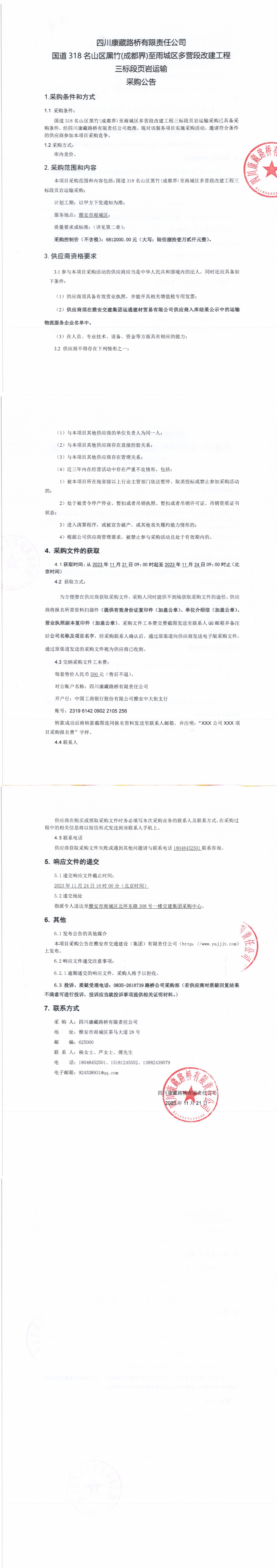 四川康藏路橋有限責(zé)任公司國(guó)道318名山區(qū)黑竹(成都界)至雨城區(qū)多營(yíng)段改建工程三標(biāo)段頁巖運(yùn)輸采購(gòu)公告