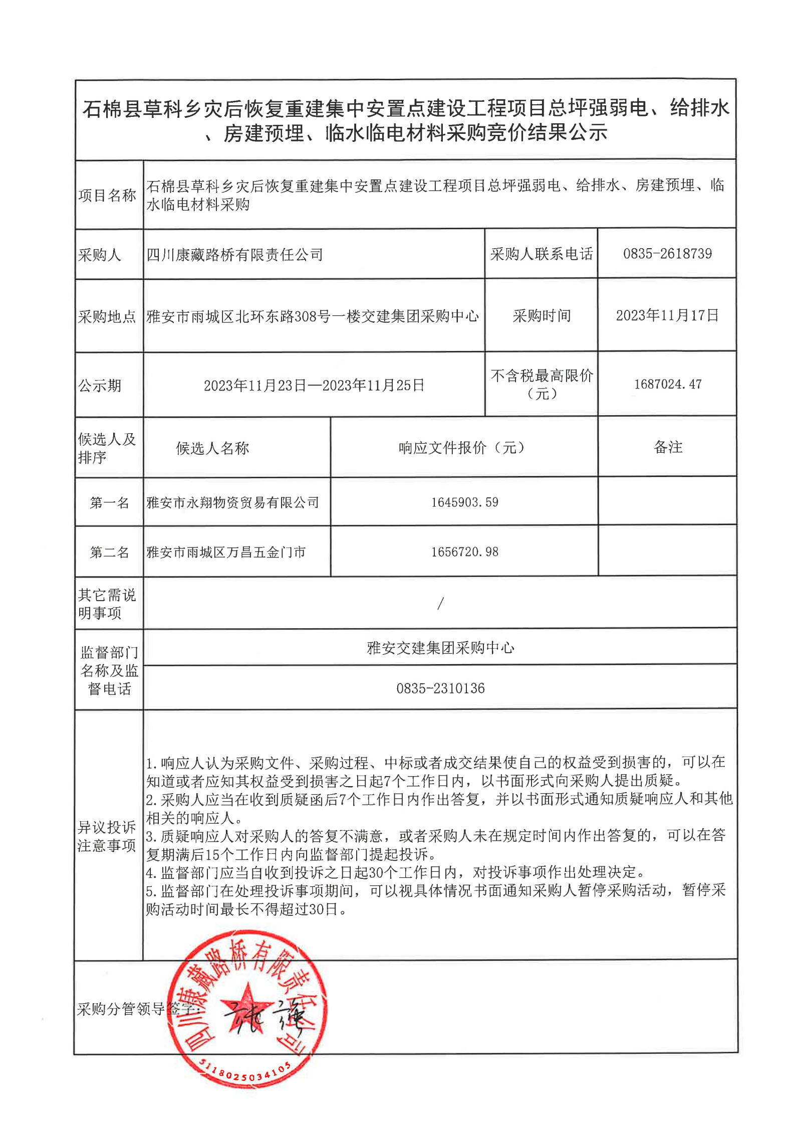 四川康藏路橋有限責任公司石棉縣草科鄉(xiāng)災(zāi)后恢復(fù)重建集中安置點建設(shè)工程項目總坪強弱電、給排水、房建預(yù)埋、臨水臨電材料采購結(jié)果公示
