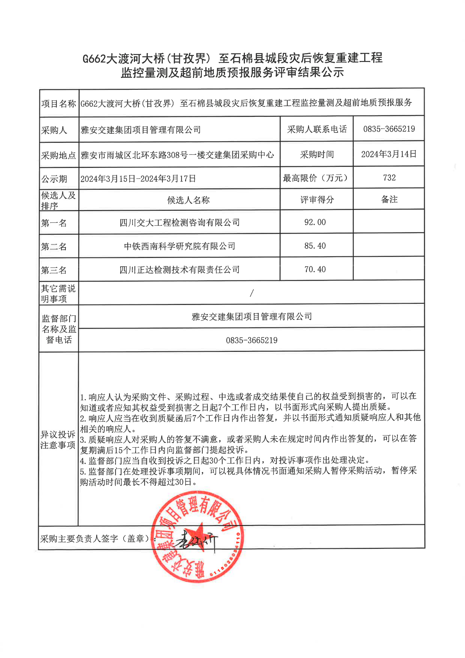 雅安交建集團(tuán)項(xiàng)目管理有限公司G662大渡河大橋(甘孜界)至石棉縣城段災(zāi)后恢復(fù)重建工程監(jiān)控量測及超前地質(zhì)預(yù)報(bào)服務(wù)評(píng)審結(jié)果公示