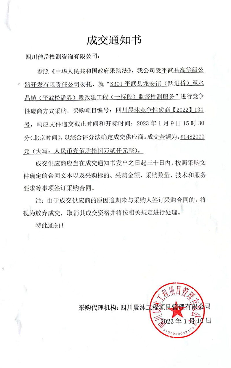 中標(biāo)項(xiàng)目為S301平武縣龍安鎮(zhèn)(躍進(jìn)橋)至水晶鎮(zhèn)(平武松潘界)段改建工程(一標(biāo)段)監(jiān)督檢測服務(wù)項(xiàng)目,成交金額148萬余元。此次成功中標(biāo)展示了公司的檢測能力和市場競爭力,為公司“走出去”積極承攬市外、省外業(yè)務(wù)增添信心。