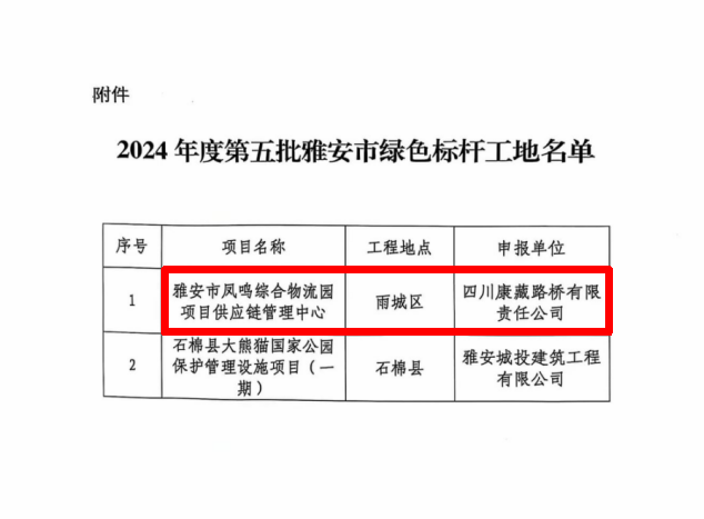 近日,由雅安交建集團康藏路橋公司建設(shè)的鳳鳴綜合物流園項目供應(yīng)鏈管理中心,經(jīng)市住建局、市生態(tài)環(huán)境局、市城管執(zhí)法局聯(lián)合評審小組綜合考評,被評為雅安市綠色標桿工地。
