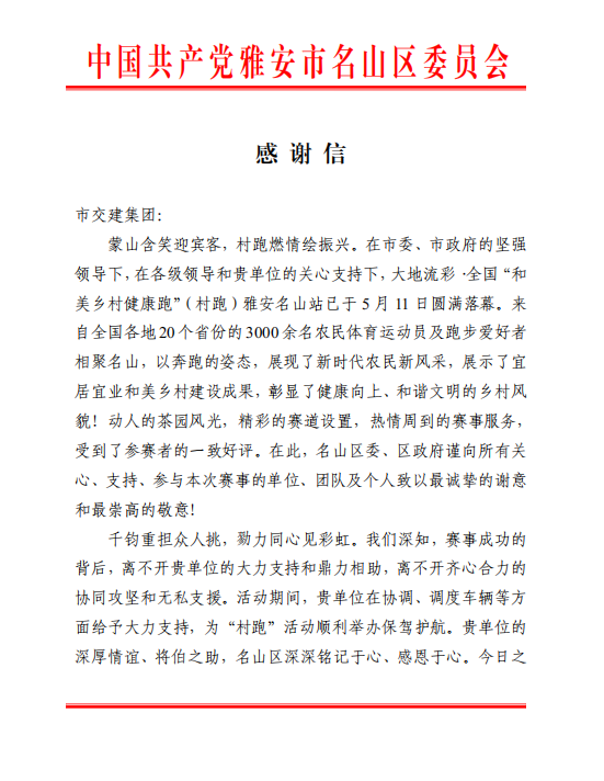 5月10日至11日,以“心向和美 逐夢茶源”為主題的大地流彩·2025年全國和美鄉(xiāng)村健康跑(村跑)雅安名山站活動在雅安市名山區(qū)成功舉辦。四川蜀通運業(yè)有限責任公司作為運輸保障單位,圓滿完成賽事期間各項運輸保障任務(wù),為活動的順利開展提供了堅實保障,受到名山區(qū)委、區(qū)政府感謝信。