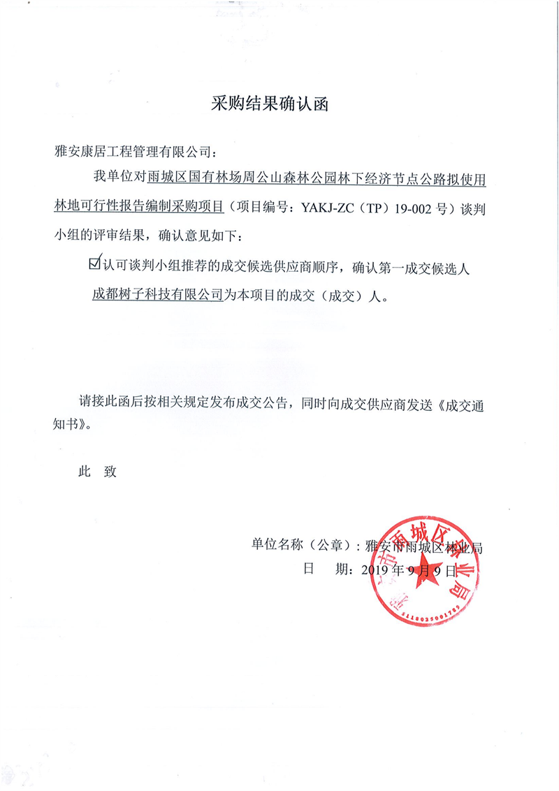 雅安市雨城區(qū)林業(yè)局雨城區(qū)國有林場周公山森林公園林下經濟節(jié)點公路擬使用林地可行性報告編制采購項目競爭性談判結果公示