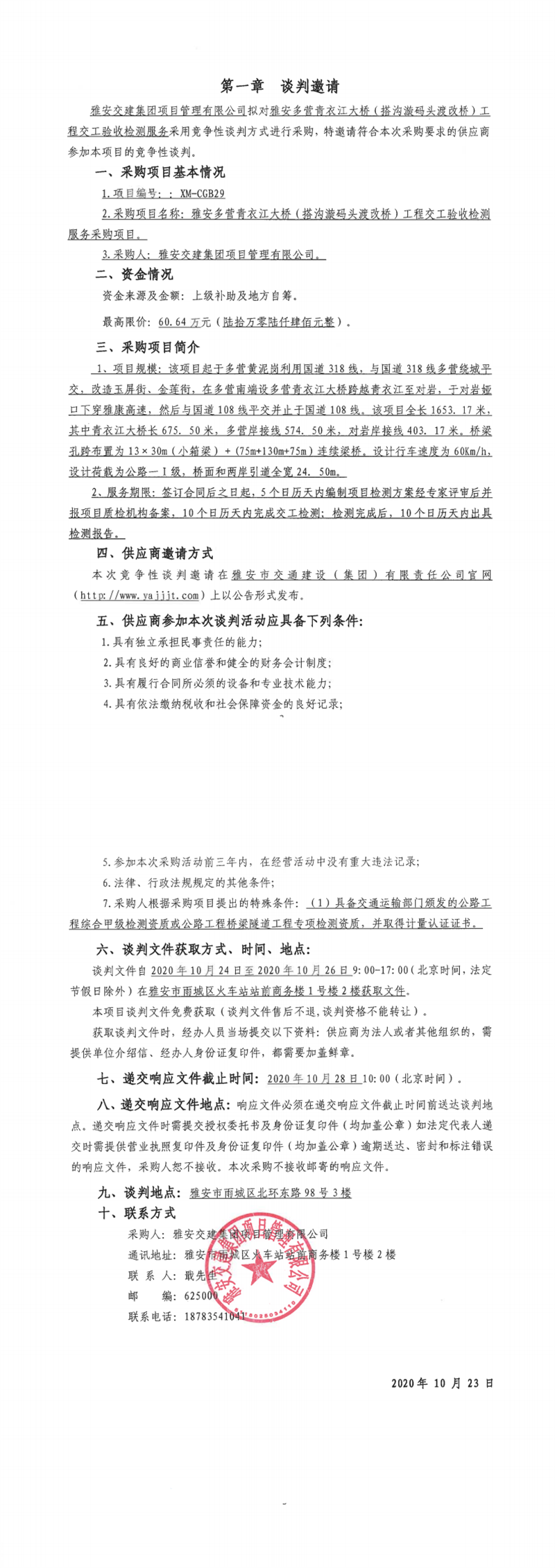 雅安交建集團(tuán)項(xiàng)目管理有限公司雅安多營青衣江大橋(搭溝漩碼頭渡改橋)工程交工驗(yàn)收檢測服務(wù)采購項(xiàng)目競爭性談判公告