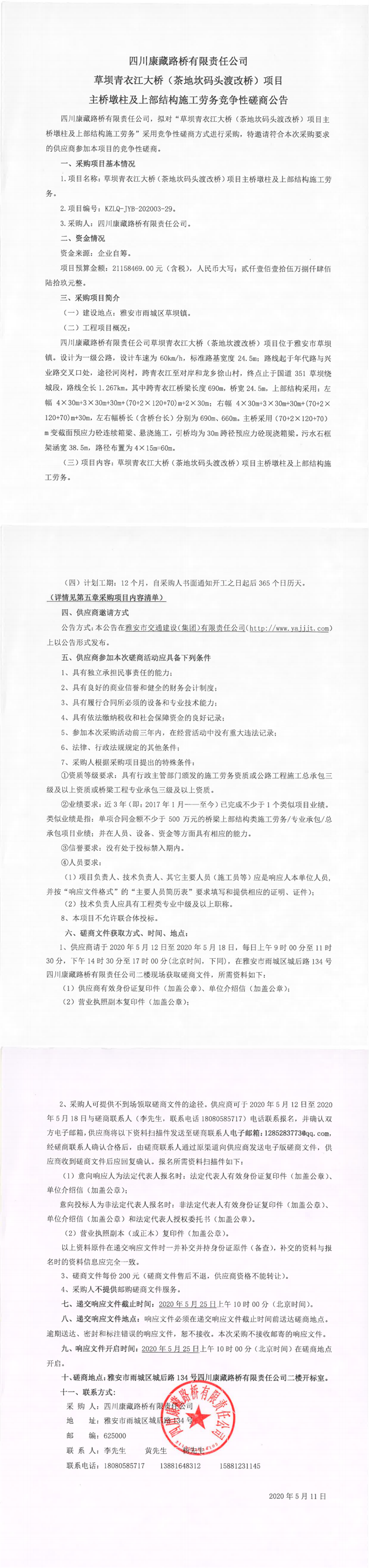 四川康藏路橋有限責任公司草壩青衣江大橋(茶地坎碼頭渡改橋)項目主橋墩柱及上部結(jié)構(gòu)施工勞務競爭性磋商公告