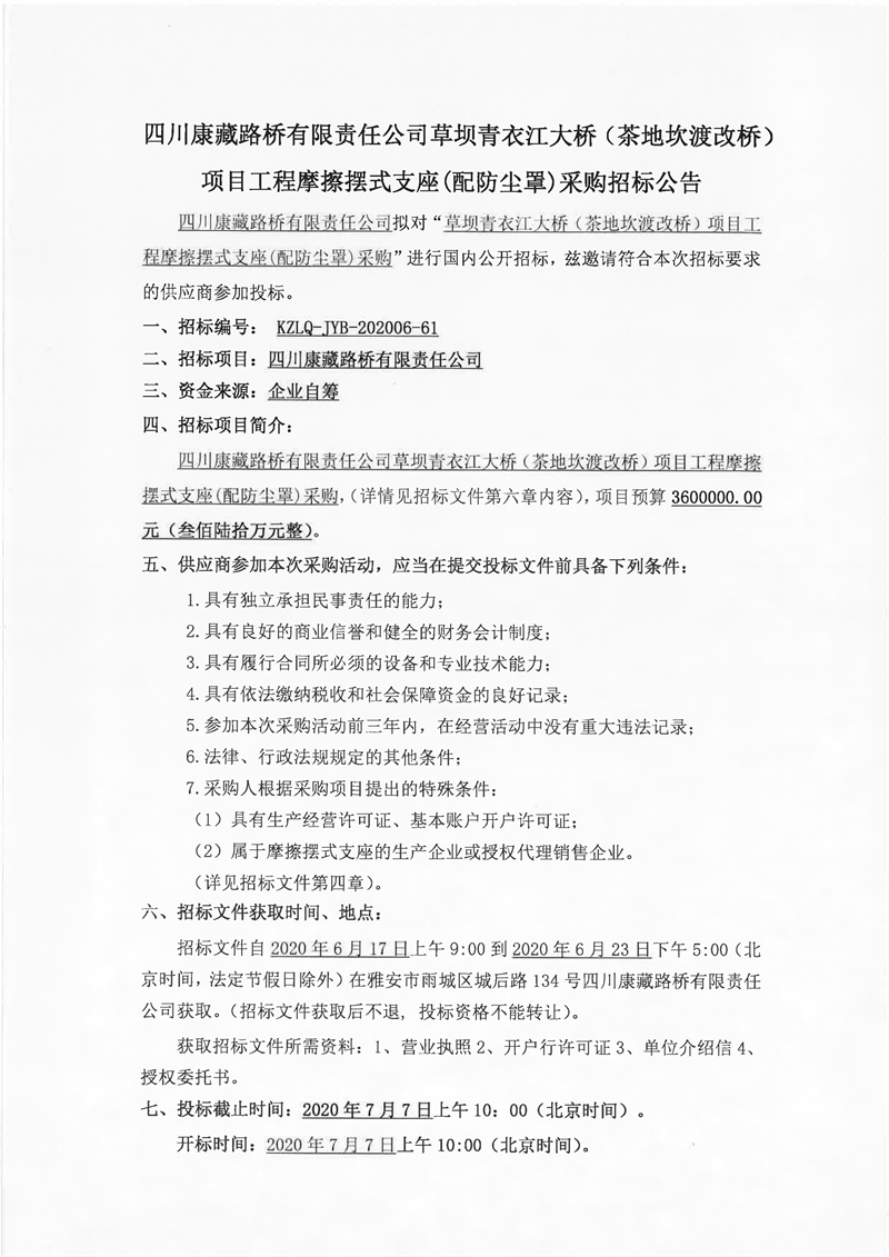 四川康藏路橋有限責(zé)任公司草壩青衣江大橋(茶地坎渡改橋)項目工程摩擦擺式支座(配防塵罩)采購招標(biāo)公告