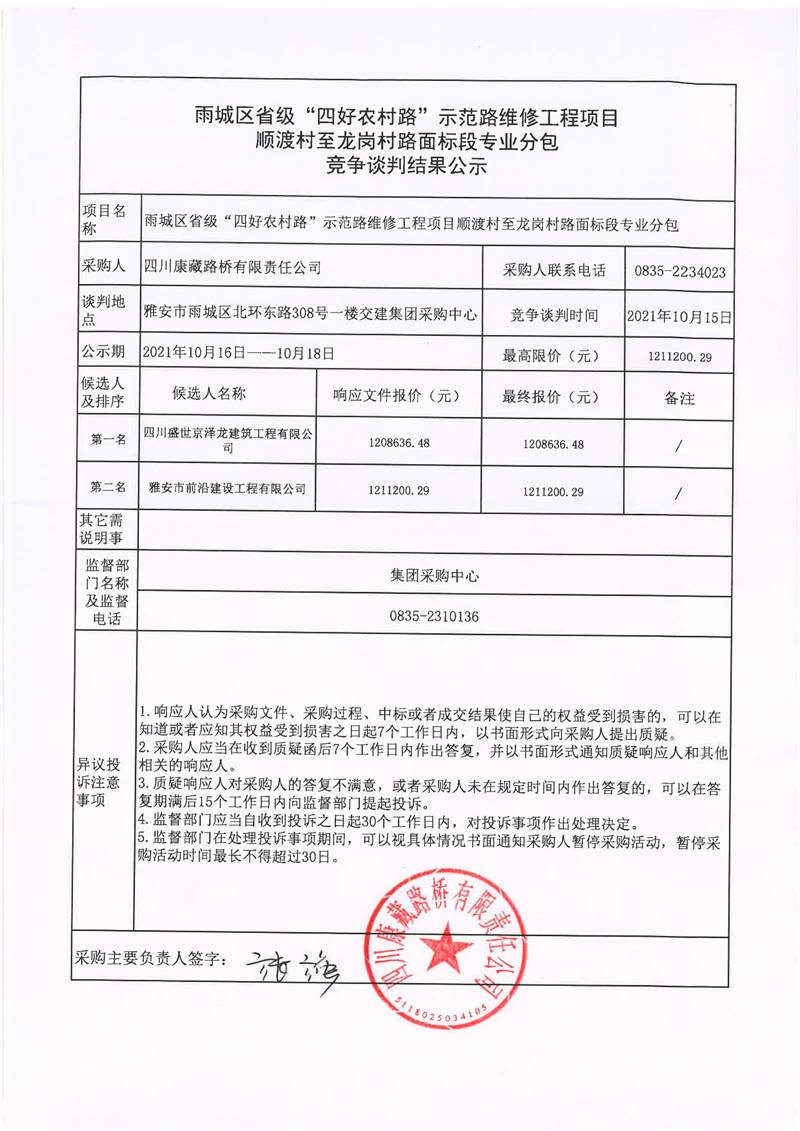 四川康藏路橋有限責(zé)任公司雨城區(qū)省級(jí)“四好農(nóng)村路”示范路維修工程項(xiàng)目順渡村至龍崗村路面標(biāo)段專業(yè)分包競(jìng)爭談判結(jié)果公示