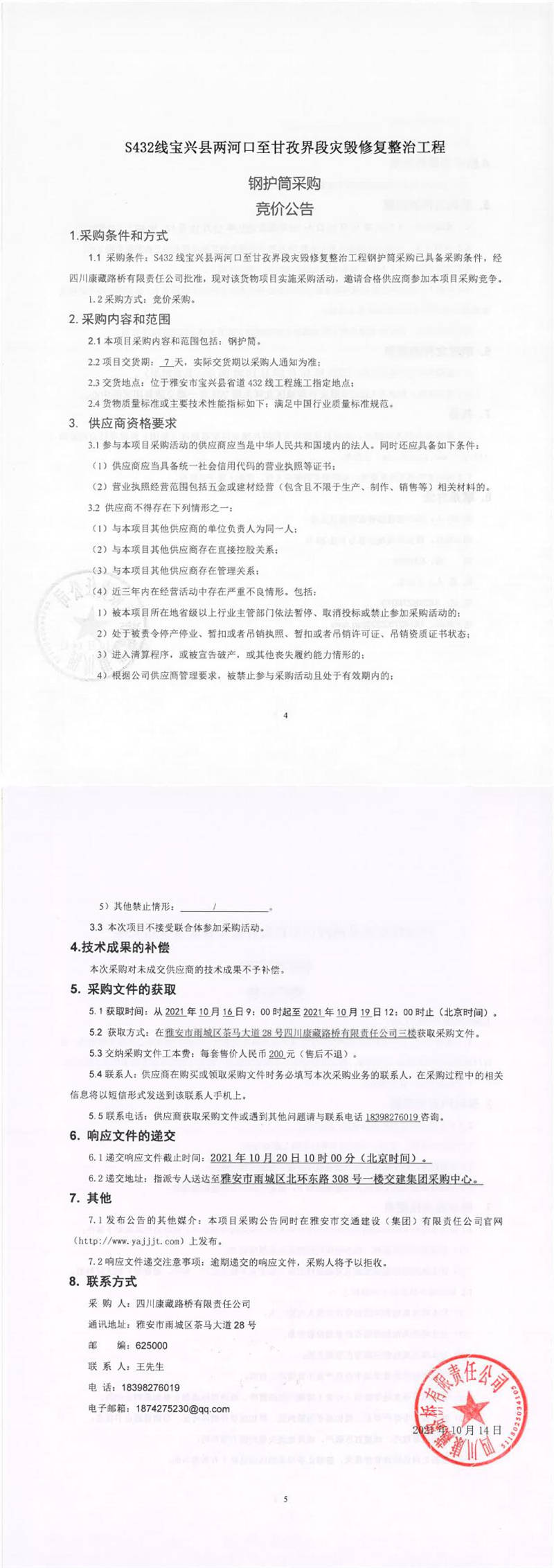 四川康藏路橋有限責任公司S432線寶興縣兩河口至甘孜界段災(zāi)毀修復(fù)整治工程鋼護筒采購競價公告