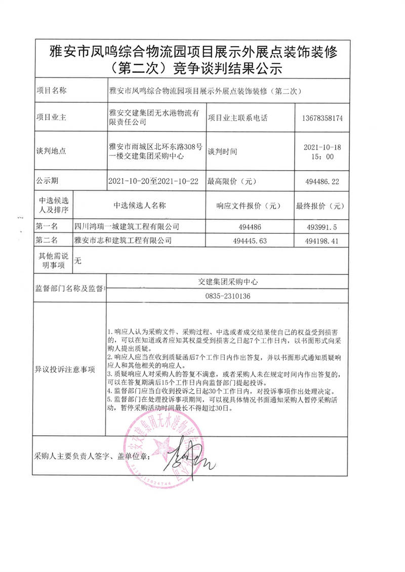 雅安交建集團(tuán)無(wú)水港物流有限責(zé)任公司雅安市鳳鳴綜合物流園項(xiàng)目展示外展點(diǎn)裝飾裝修(第二次)競(jìng)爭(zhēng)談判結(jié)果公示