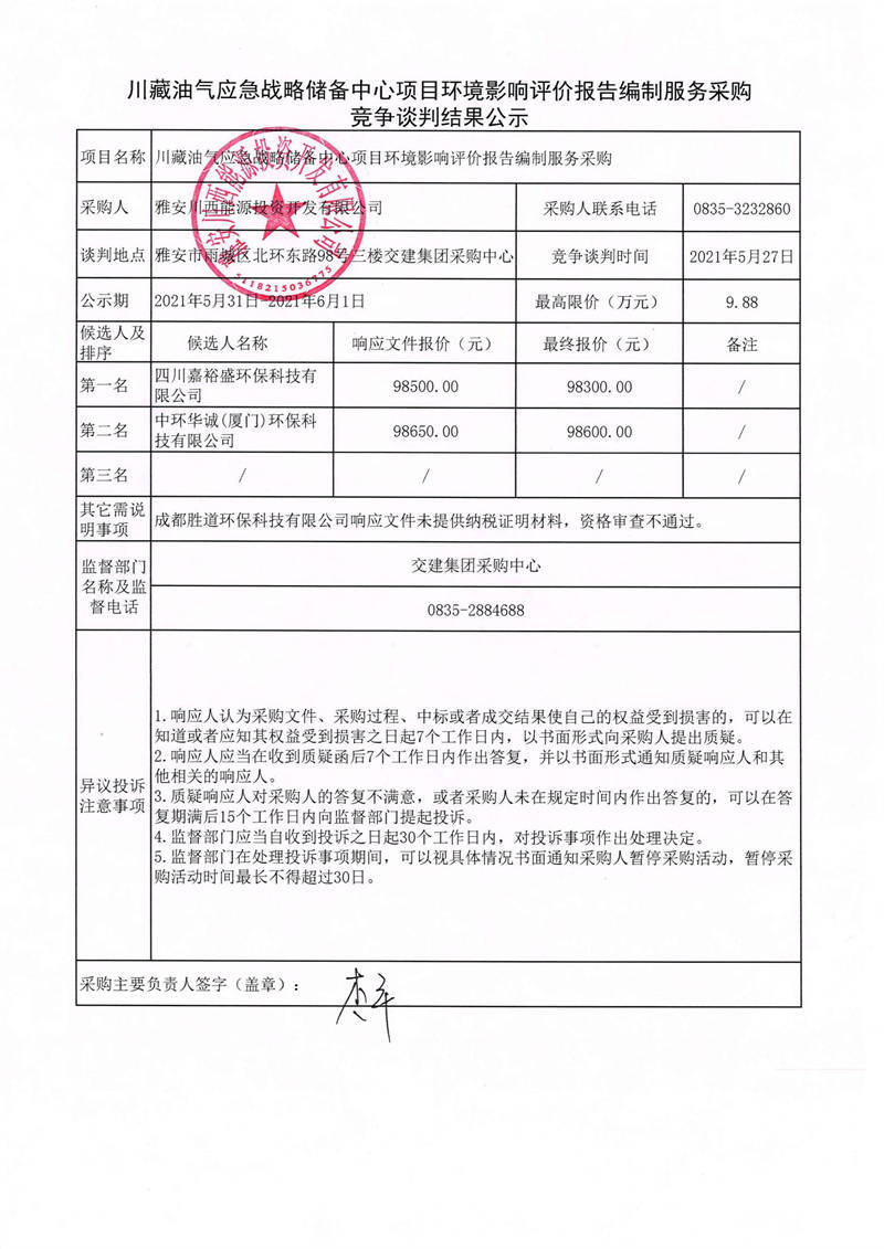 雅安川西能源投資開發(fā)有限公司川藏油氣應(yīng)急戰(zhàn)略儲備中心項(xiàng)目環(huán)境影響評價報(bào)告編制服務(wù)采購競爭性談判結(jié)果公示
