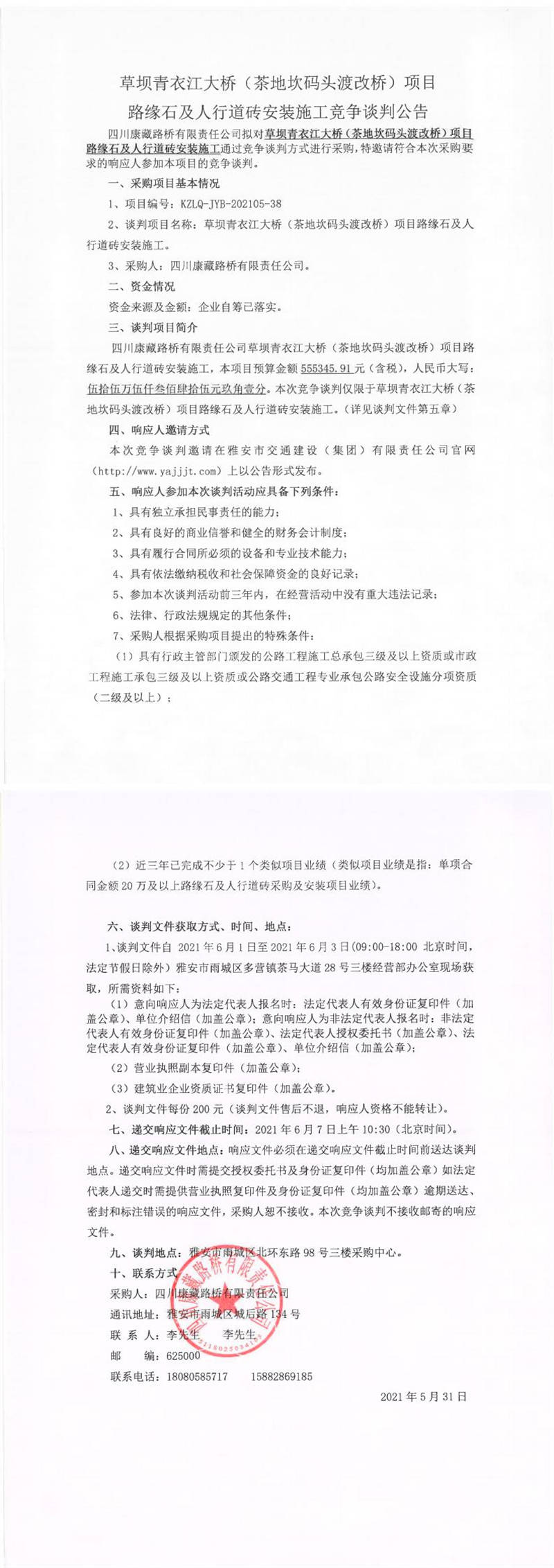 四川康藏路橋有限責(zé)任公司草壩青衣江大橋(茶地坎碼頭渡改橋)項(xiàng)目路緣石及人行道磚安裝施工競爭談判公告