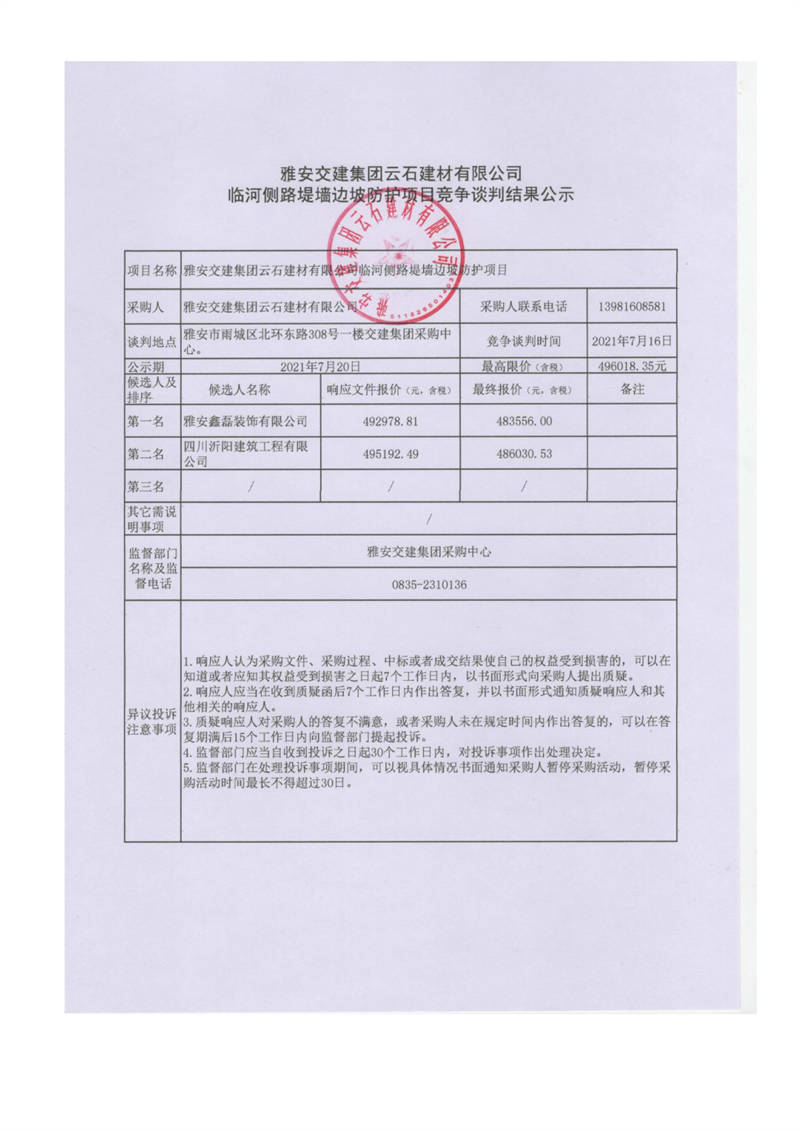 雅安交建集團云石建材有限公司臨河側路堤墻邊坡防護項目競爭談判結果公示