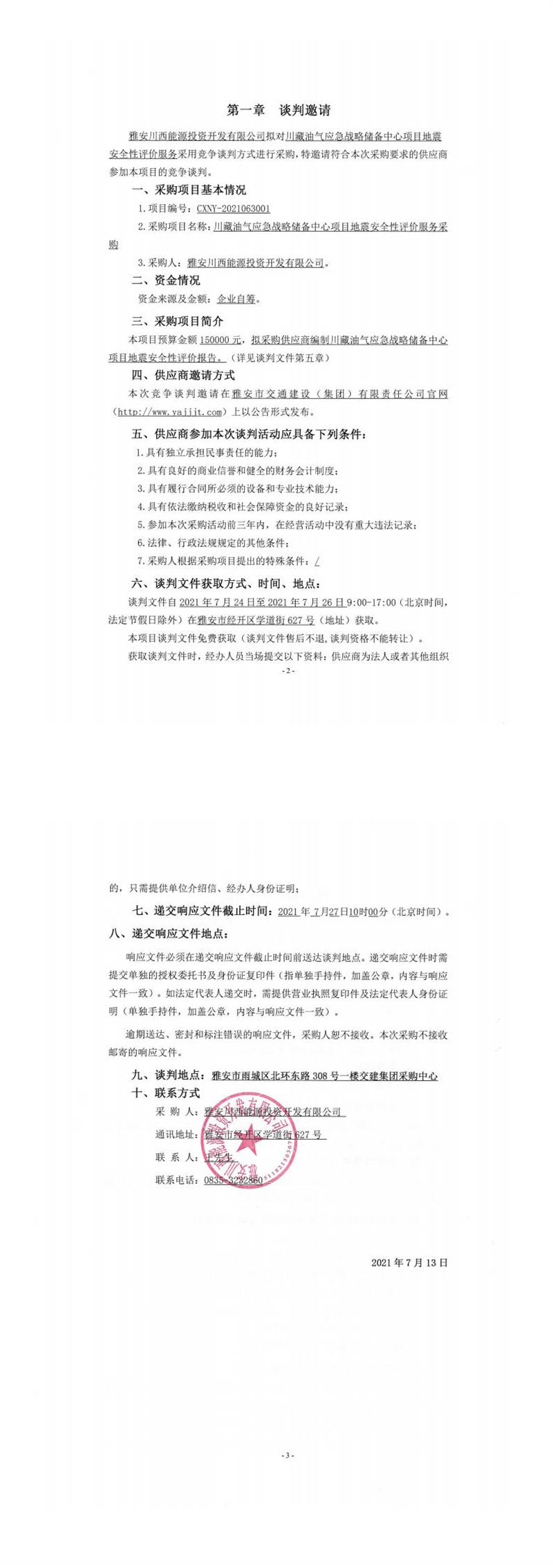 雅安川西能源投資開發(fā)有限公司川藏油氣應(yīng)急戰(zhàn)略儲備中心項目地震安全性評價服務(wù)采購競爭談判公告