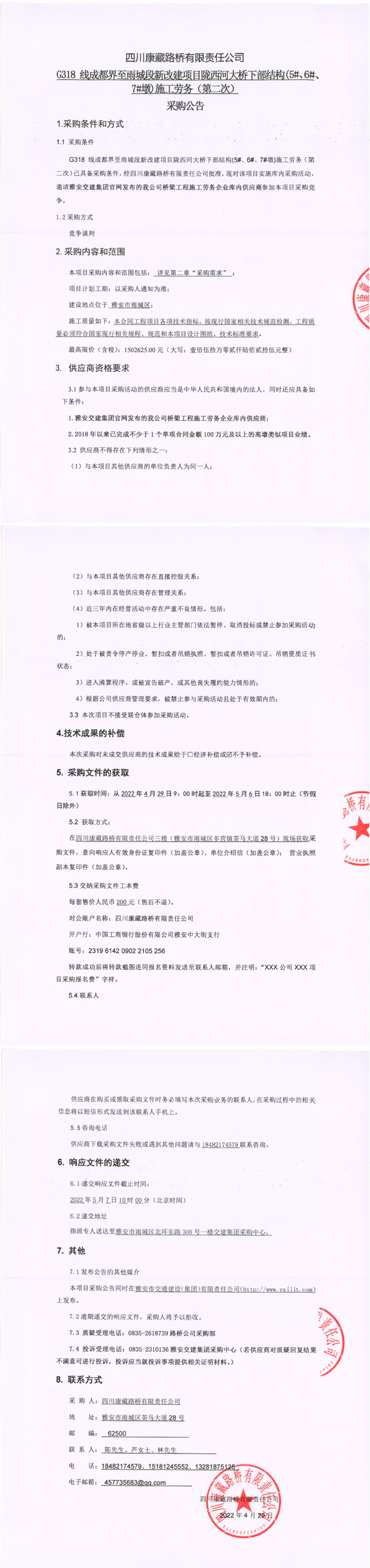 四川康藏路橋有限責(zé)任公司G318線成都界至雨城段新改建項目隴西河大橋下部結(jié)構(gòu)(5#、6#、7#墩)施工勞務(wù)(第二次)采購公告