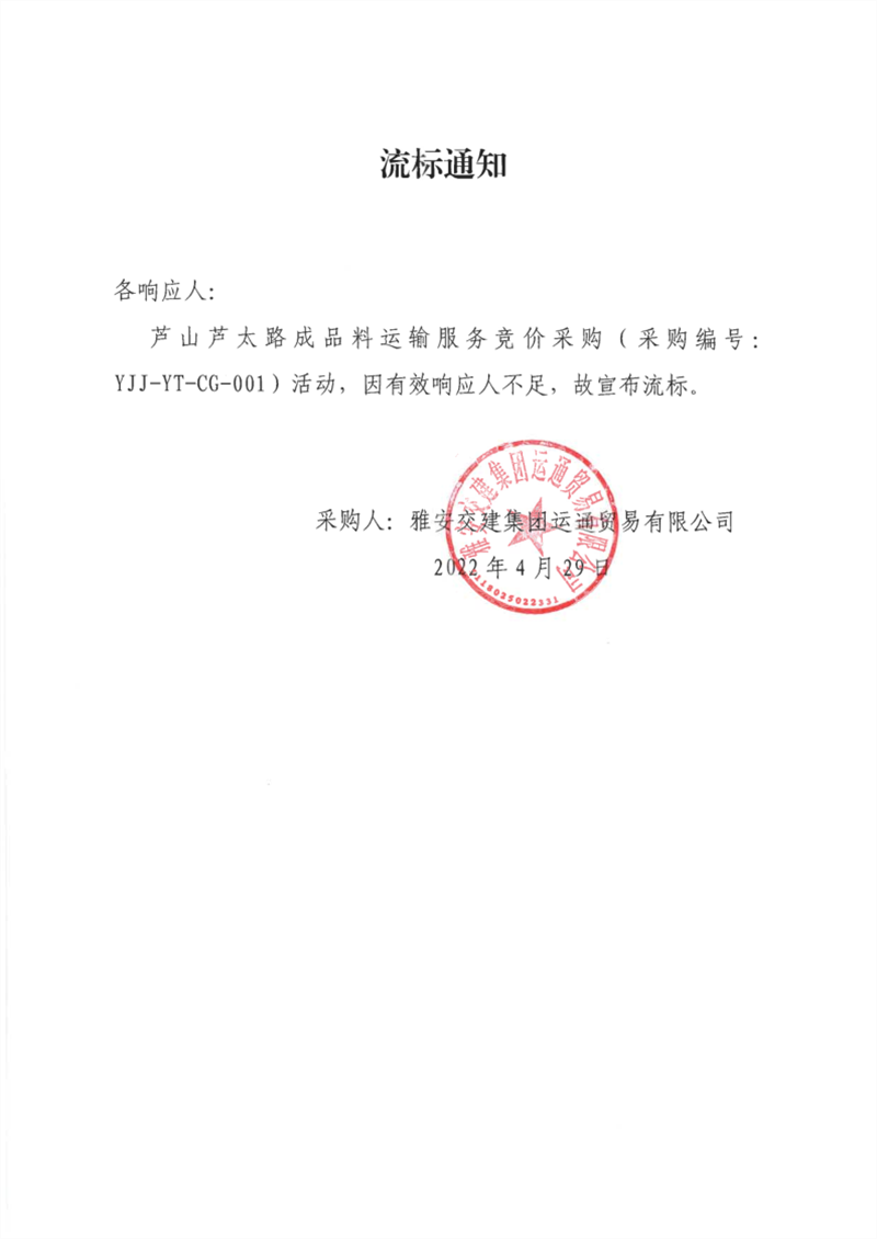 雅安交建集團運通貿(mào)易有限公司蘆山蘆太路成品料運輸服務競價采購流標通知