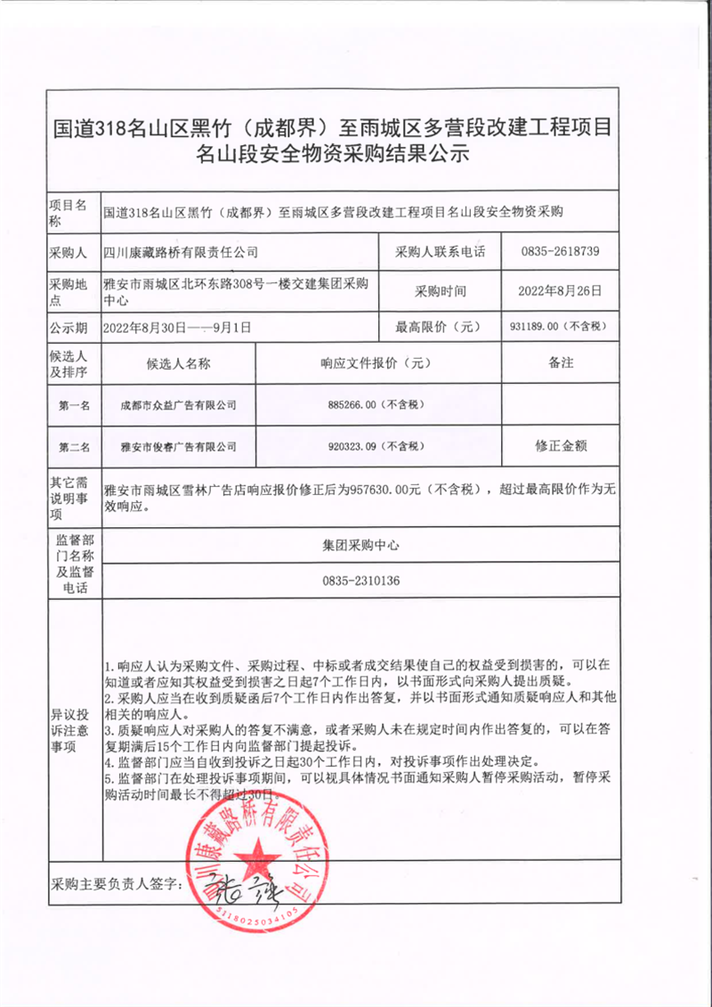 四川康藏路橋有限責(zé)任公司國(guó)道318名山區(qū)黑竹(成都界)至雨城區(qū)多營(yíng)段改建工程項(xiàng)目名山段安全物資采購(gòu)結(jié)果公示
