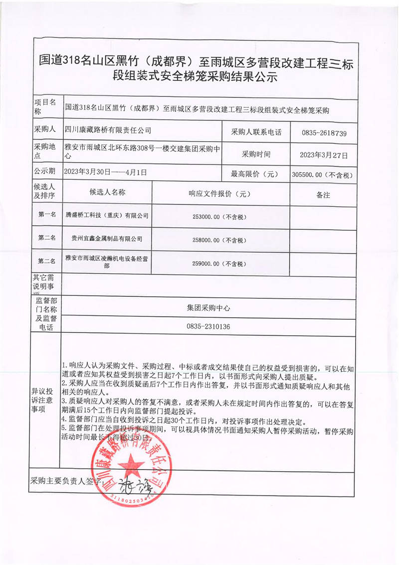 四川康藏路橋有限責(zé)任公司國道318名山區(qū)黑竹(成都界)至雨城區(qū)多營段改建工程三標段組裝式安全梯籠采購結(jié)果公示