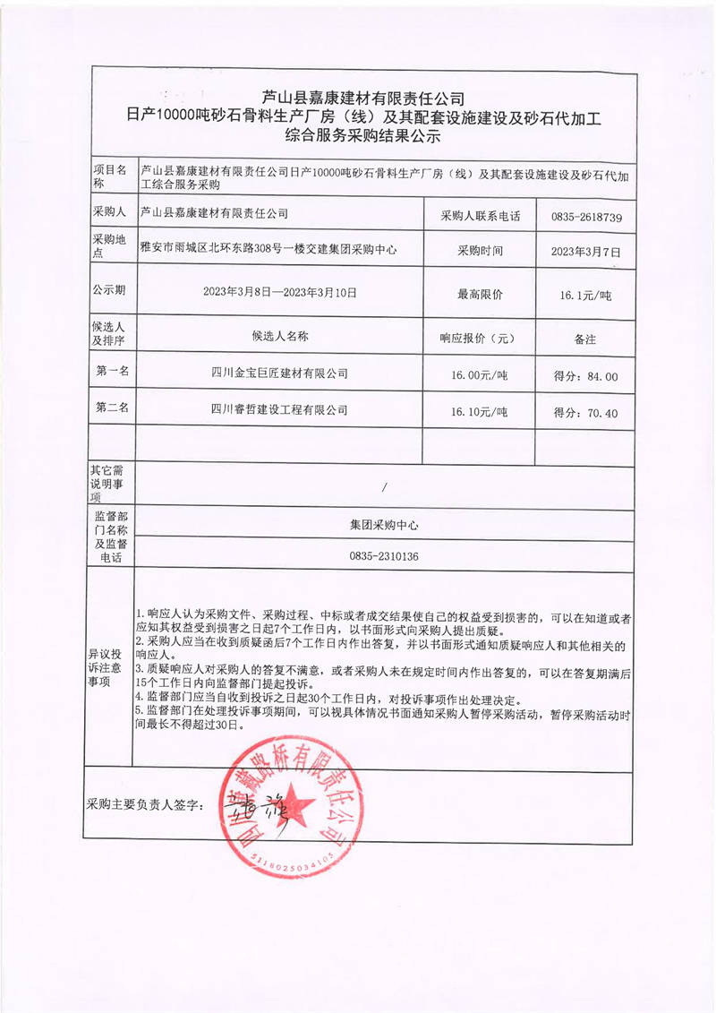 蘆山縣嘉康嘉康建材有限責任公司日產(chǎn)10000噸砂石骨料生產(chǎn)廠房(線)及其配套設施建設及砂石代加工綜合服務采購結果公示