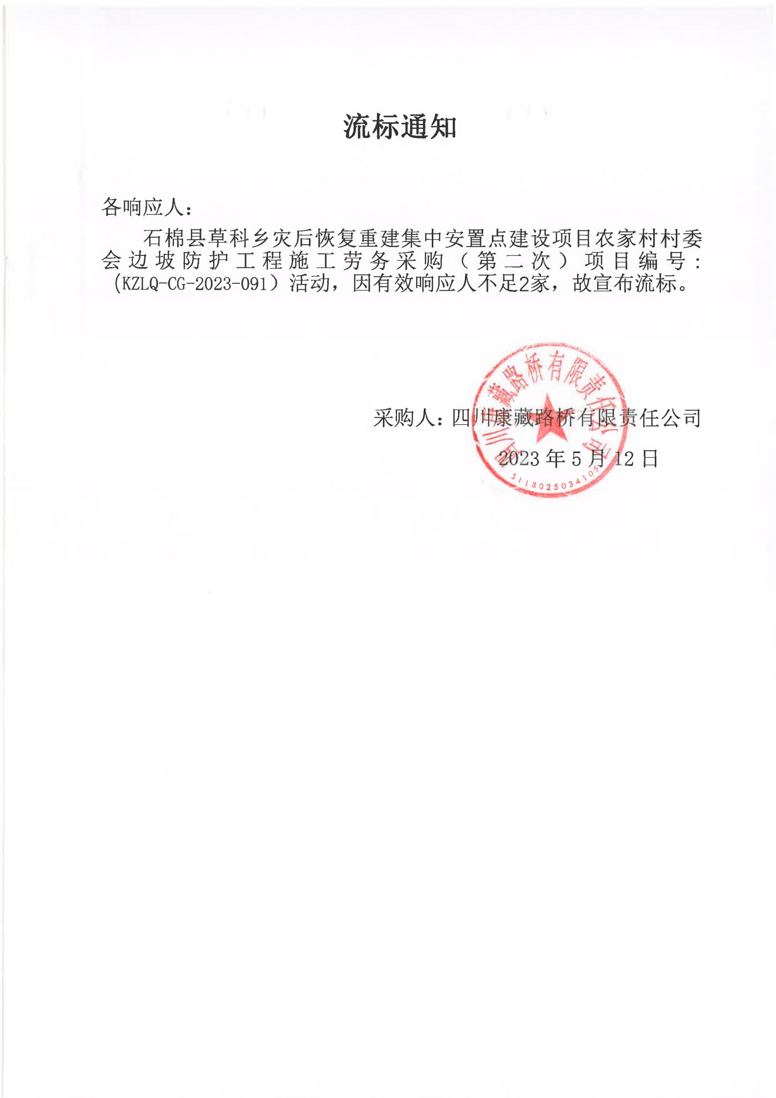 四川康藏路橋有限責任公司石棉草科鄉(xiāng)集中安置點建設(shè)項目農(nóng)家村村委會邊坡防護工程施工勞務(wù)采購(第二次)流標通知