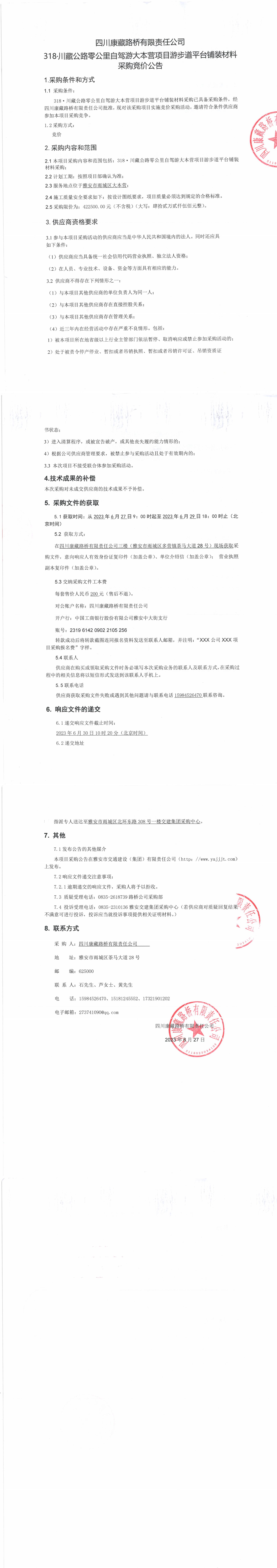 四川康藏路橋有限責(zé)任公司318·川藏公路零公里自駕游大本營(yíng)項(xiàng)目步游道平臺(tái)鋪裝材料采購(gòu)競(jìng)價(jià)公告