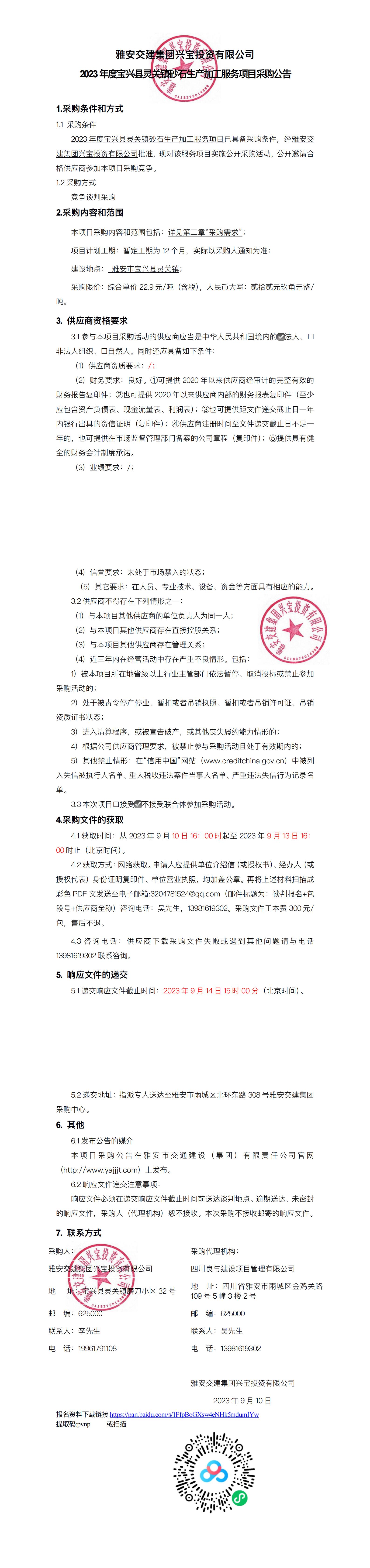 雅安交建集團(tuán)興寶投資有限公司2023年度寶興縣靈關(guān)鎮(zhèn)砂石生產(chǎn)加工服務(wù)項目采購公告