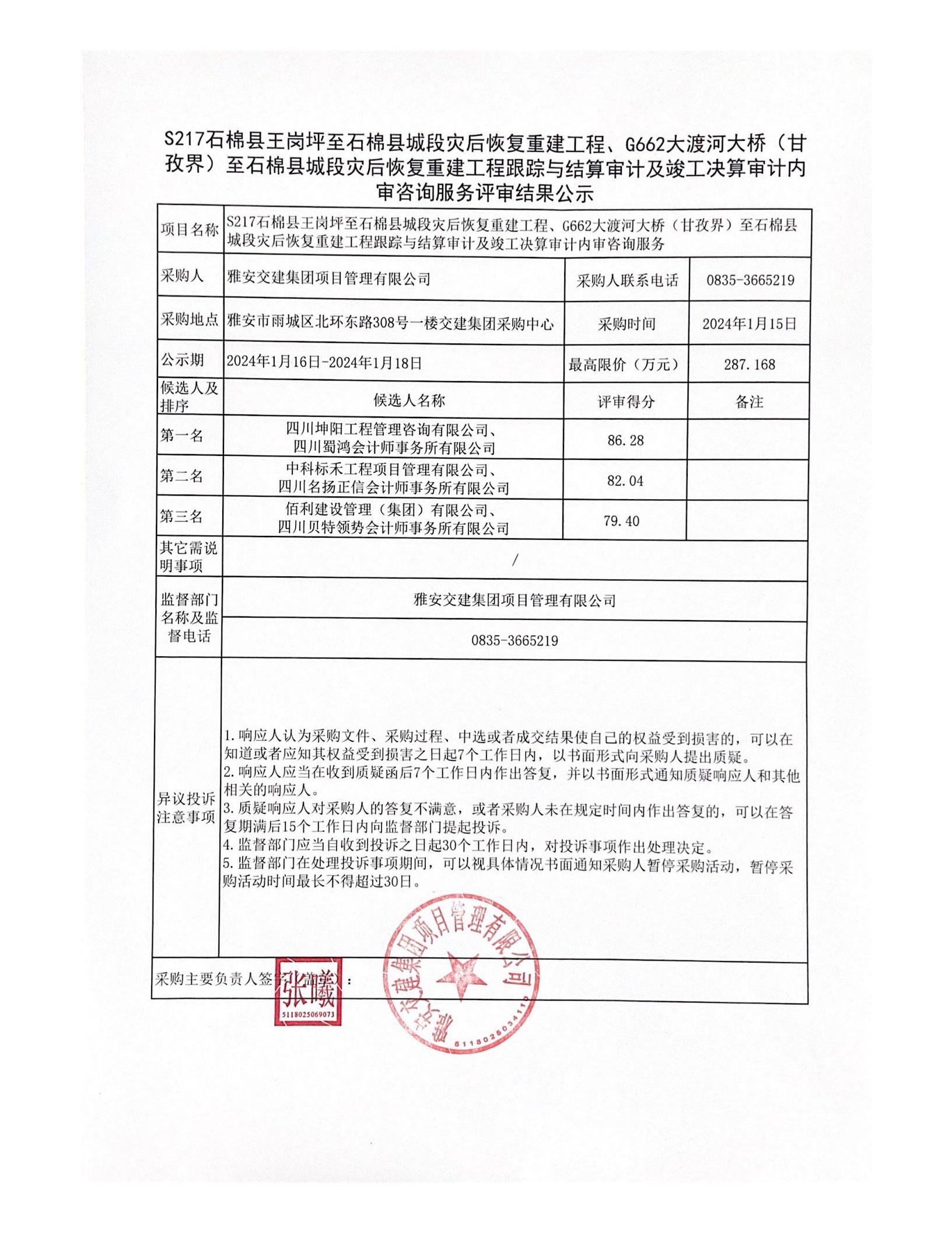 雅安交建集團(tuán)項目管理有限公司S217石棉縣王崗坪至石棉縣城段災(zāi)后恢復(fù)重建工程、G662大渡河大橋(甘孜界)至石棉縣城段災(zāi)后恢復(fù)重建工程跟蹤與結(jié)算審計及竣工決算審計內(nèi)審咨詢服務(wù)評審結(jié)果公示