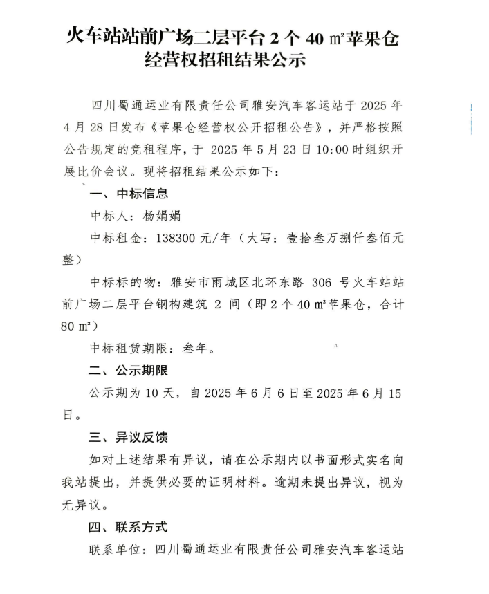 火車站站前廣場二層平臺2個40㎡蘋果倉經營權招租結果公示