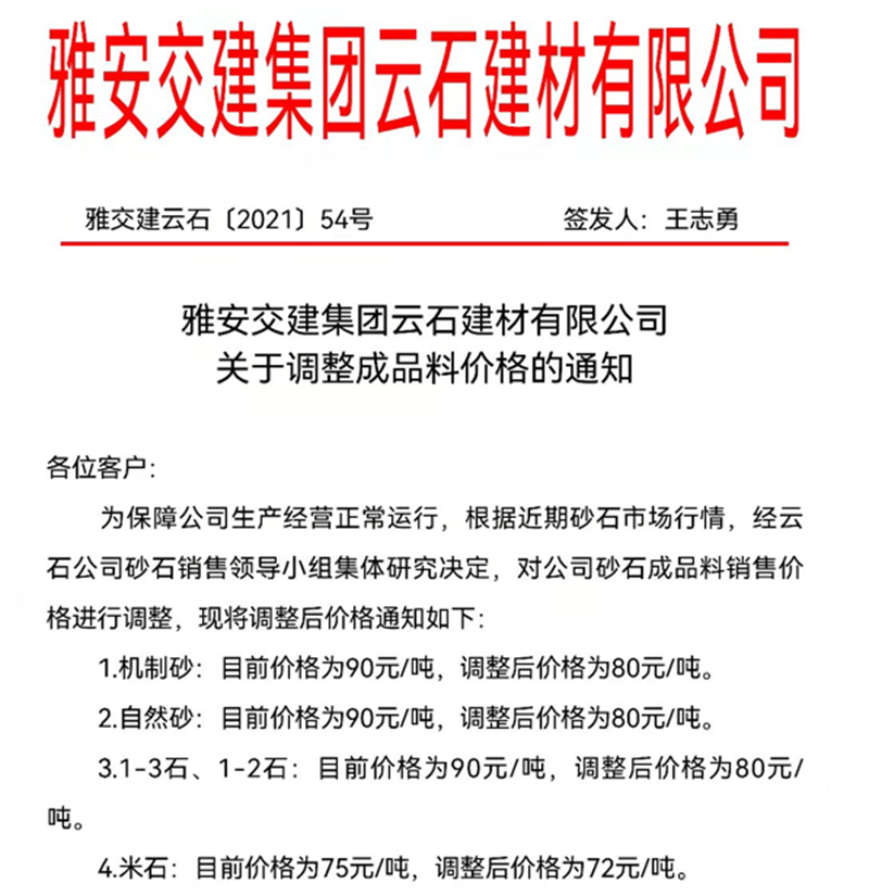 雅安交建集團(tuán)云石公司關(guān)于調(diào)整成品料銷(xiāo)售價(jià)格的通知(2021.11.4)
