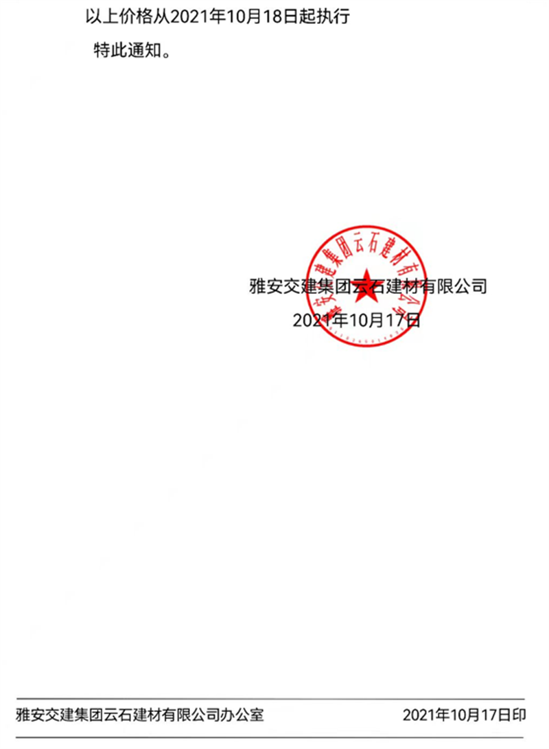 雅安交建集團(tuán)云石公司關(guān)于調(diào)整成品料銷(xiāo)售價(jià)格的通知(2021.10.17)