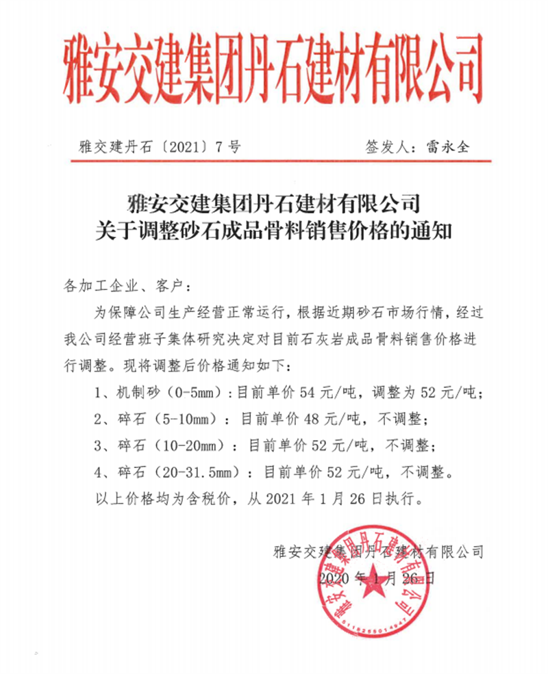 雅安交建集團丹石公司石灰?guī)r成品骨料掛牌價(2021.1.26)