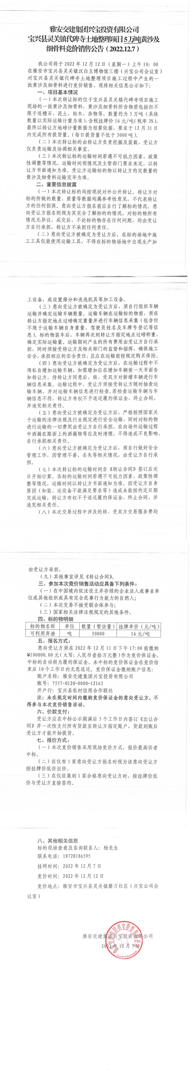雅安交建集團(tuán)興寶投資有限公司寶興縣靈關(guān)鎮(zhèn)代碑寺土地整理項(xiàng)目5萬(wàn)噸黃沙及細(xì)骨料競(jìng)價(jià)銷(xiāo)售成交公告(2022-12-12)