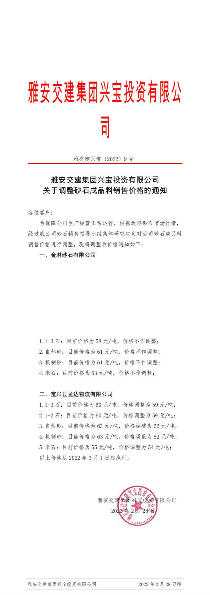 ÑŰ²½»½¨¼¯ˆF(tu¨¢n)ÅdŒšÍ¶ÙYÓÐÏÞ¹«Ë¾ êP(gu¨¡n)ÓÚÕ{(di¨¤o)Õûɰʯ³ÉÆ·ÁÏäN(xi¨¡o)ÊÛƒr(ji¨¤)¸ñµÄ֪ͨ£¨2022-2-23£©