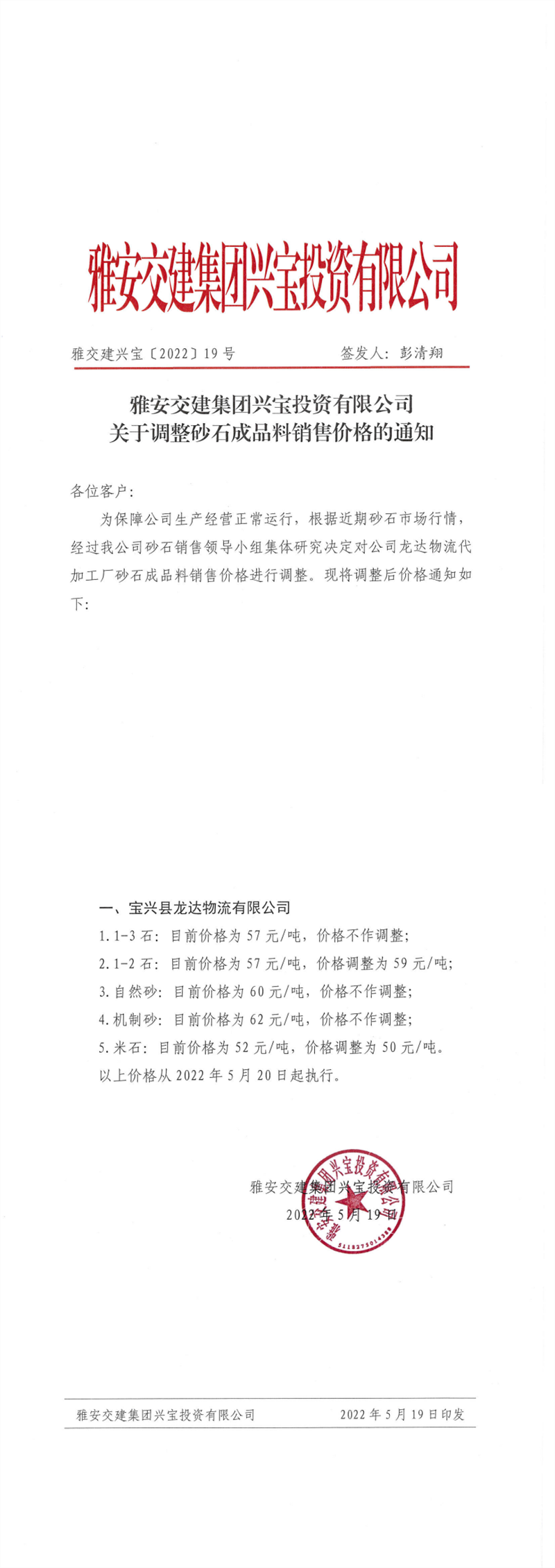 雅安交建集團興寶公司關于調整砂石成品料銷售價格的通知-2022-5-19