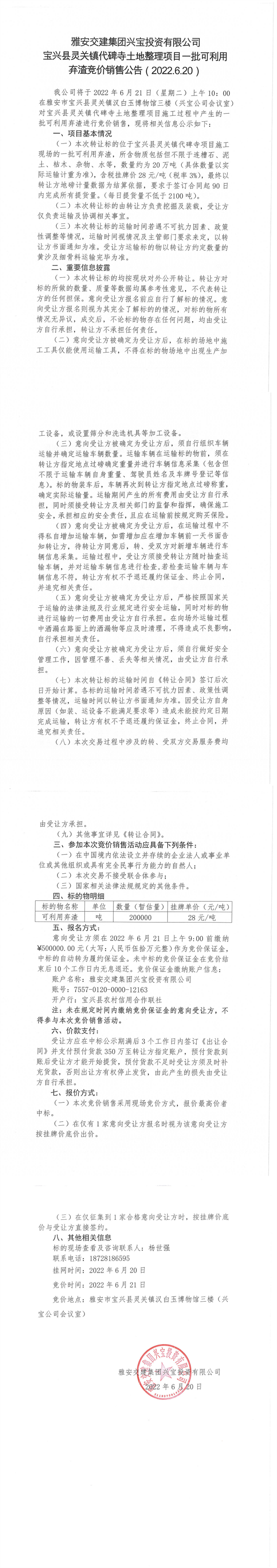 雅安交建集團興寶投資有限公司寶興縣靈關(guān)鎮(zhèn)代碑寺土地整理項目-批可利用 棄渣競價銷售公告( 2022.6.20 )