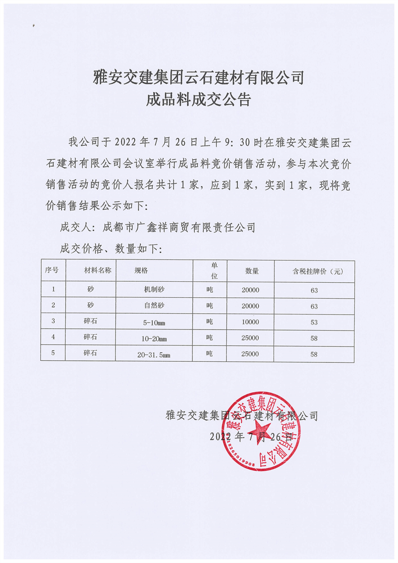雅安交建集團(tuán)云石建材有限公司成品料競價(jià)銷售成交公告7.26