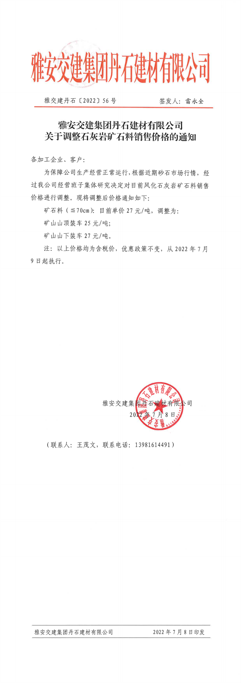 雅交建丹石關(guān)于調(diào)整石灰?guī)r礦石料銷(xiāo)售價(jià)格的通知(2022-7-8)