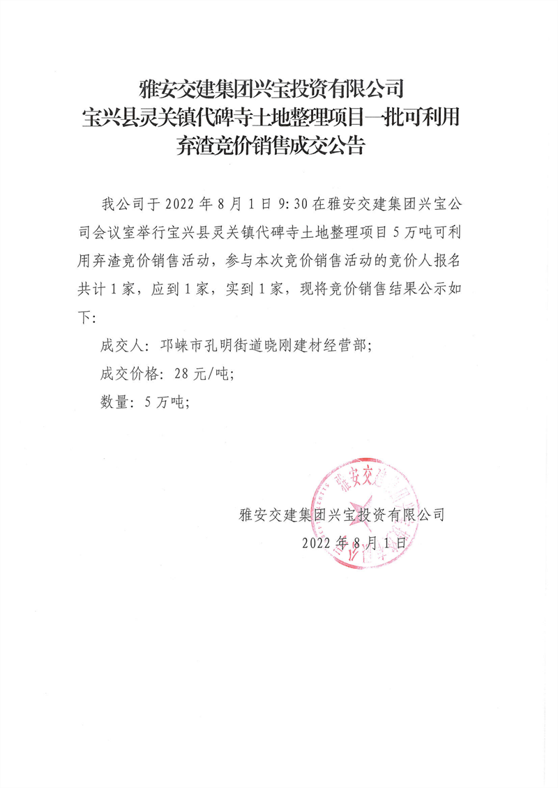 雅安交建集團興寶投資有限公司靈關(guān)鎮(zhèn)代碑寺土地整理項目5萬噸可利用棄渣競價銷售成交公告(2022.8.1)