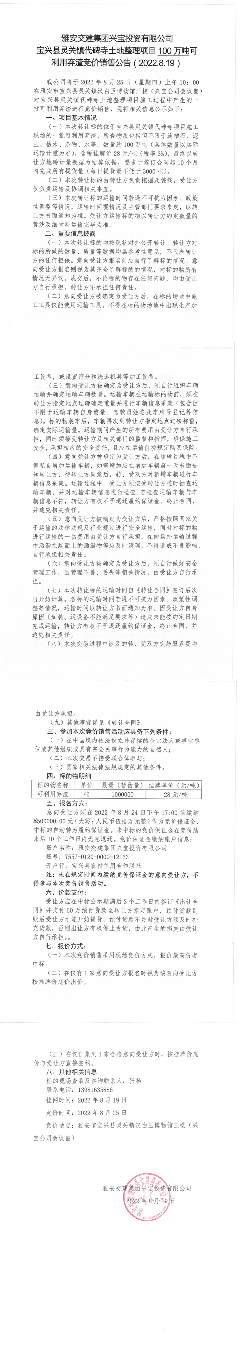 雅安交建集團(tuán)興寶投資有限公司靈關(guān)鎮(zhèn)代碑寺土地整理項目10萬噸可利用棄渣競價銷售公告(2022.8.19)(1)