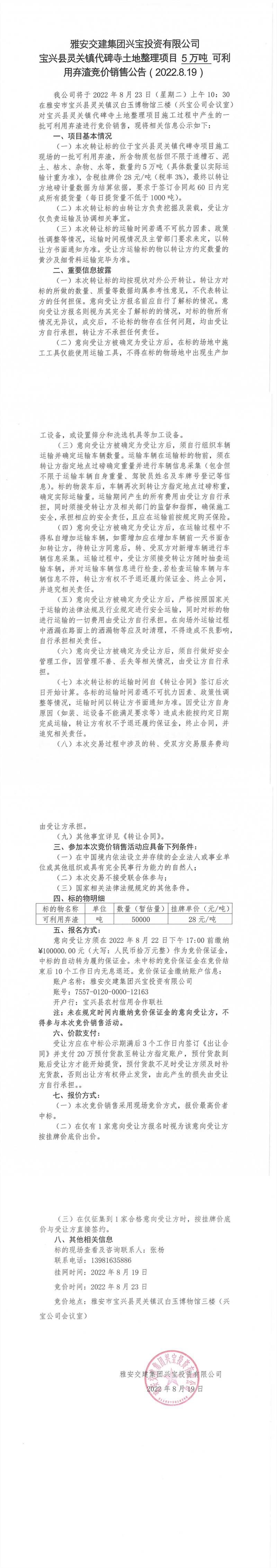 雅安交建集團(tuán)興寶投資有限公司靈關(guān)鎮(zhèn)代碑寺土地整理項(xiàng)目5萬噸可利用棄渣競(jìng)價(jià)銷售公告(2022.8.19)(1)