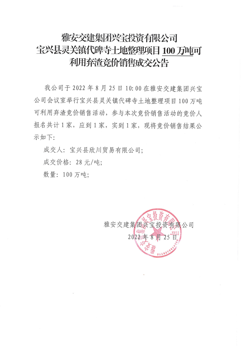 雅安交建集團(tuán)興寶投資有限公司寶興縣靈關(guān)鎮(zhèn)代碑寺土地整理項(xiàng)目5萬(wàn)噸可利用棄渣競(jìng)價(jià)銷(xiāo)售成交公告(8.23)
