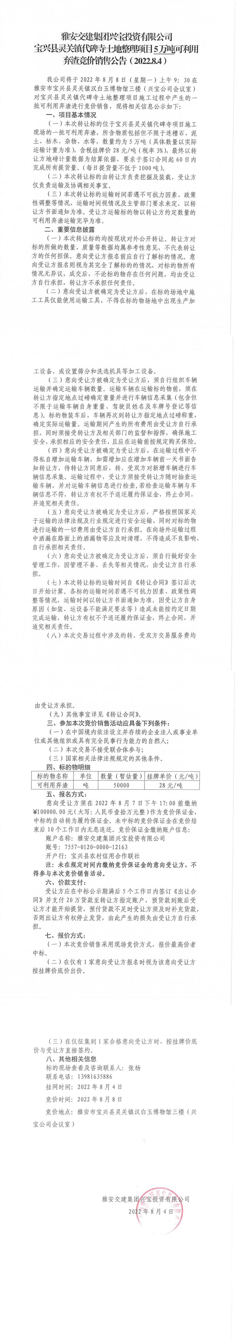 雅安交建集團(tuán)興寶投資有限公司靈關(guān)鎮(zhèn)代碑寺土地整理項(xiàng)目5萬(wàn)噸可利用棄渣競(jìng)價(jià)銷售公告(2022.8.4)