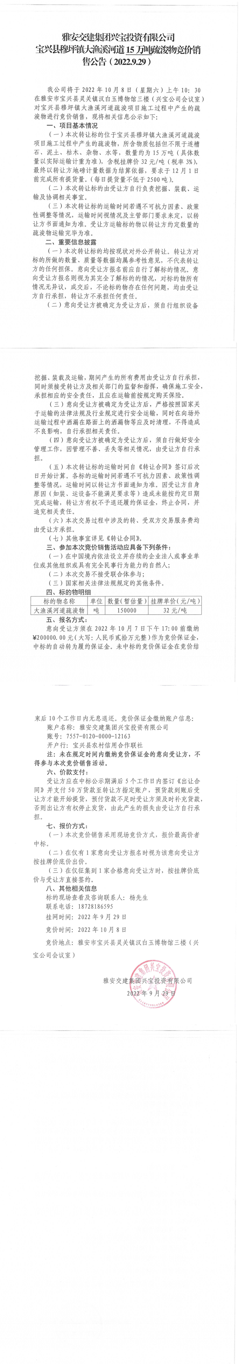 雅安交建集團(tuán)興寶投資有限公司寶興縣穆坪鎮(zhèn)大漁溪河道15萬(wàn)噸疏浚物競(jìng)價(jià)銷(xiāo)售公告(2022.9.29)