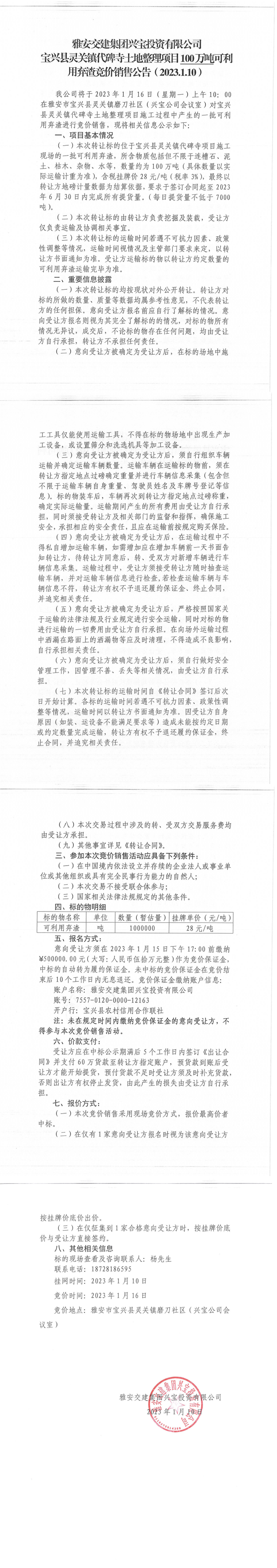 雅安交建集團(tuán)興寶投資有限公司靈關(guān)鎮(zhèn)代碑寺土地整理項(xiàng)目100萬噸可利用棄渣競價銷售公告(2023.1.10)