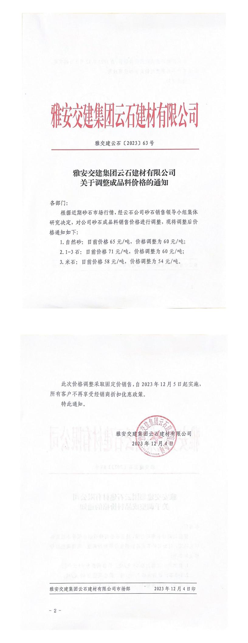 雅安交建集團(tuán)云石建材有限公司成品料銷(xiāo)售價(jià)格調(diào)整公告(2023-12-04)