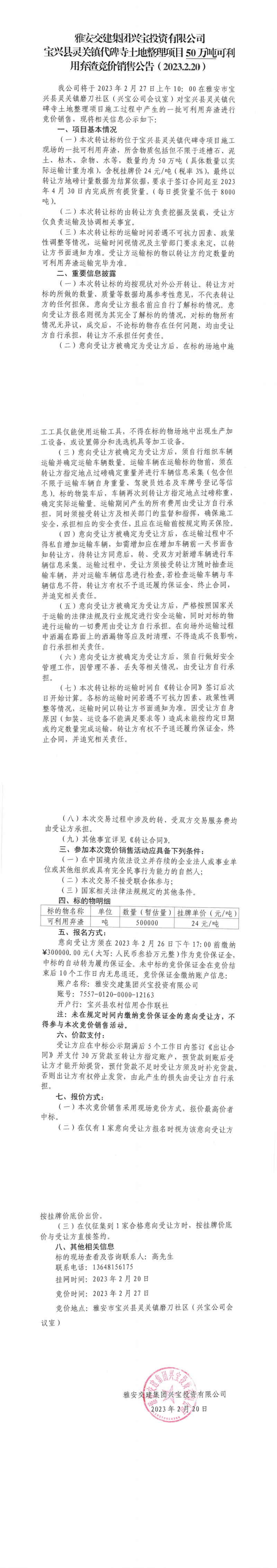 雅安交建集團(tuán)興寶投資有限公司靈關(guān)鎮(zhèn)代碑寺土地整理項(xiàng)目50萬噸可利用棄渣競價(jià)銷售公告(2023.2.20)、