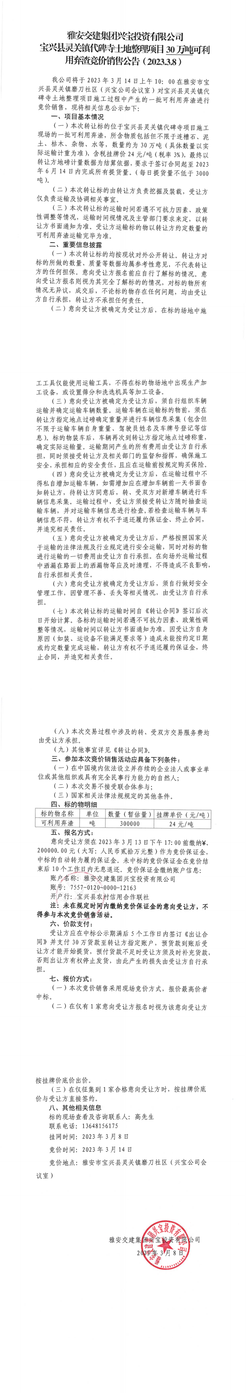 雅安交建集團(tuán)興寶投資有限公司靈關(guān)鎮(zhèn)代碑寺土地整理項(xiàng)目30萬(wàn)噸可利用棄渣競(jìng)價(jià)銷(xiāo)售公告(2023.3.8)