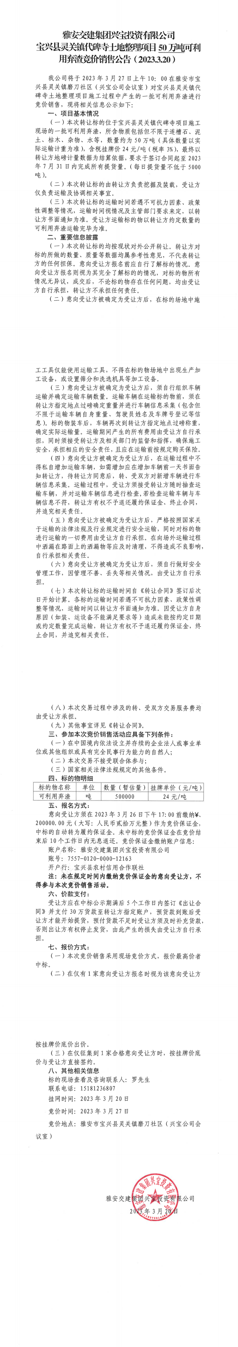 雅安交建集團(tuán)興寶投資有限公司代碑寺土地整理項(xiàng)目50萬(wàn)噸可利用棄渣競(jìng)價(jià)銷(xiāo)售公告(2023.3.20)