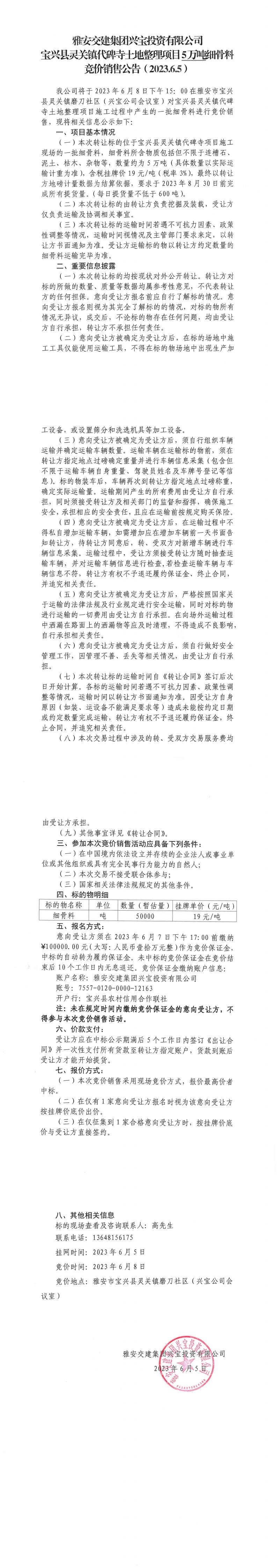 雅安交建集團(tuán)興寶投資有限公司寶興縣靈關(guān)鎮(zhèn)代碑寺土地整理項(xiàng)目5萬(wàn)噸細(xì)骨料競(jìng)價(jià)銷售公告(2023.6.5)
